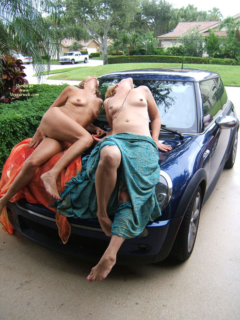 Jackie Lee and JLH came to visit Tasty Unit and I in sunny F-L-A. Unfortunately, I had to go to work on the first full day of their visit. I imagined that they would spend the day at the beach. Well, they did. But still, I came home from work in the afternoon to find TU and JL doing a naked scarf dance, Paco the Cabana Boy with a really big grin on his face, and a couple of empty wine bottles on the kitchen counter. Looking to exploit the situation, I said, Hey, lets go do a shoot on my MINI Cooper to make Cam jealous. Cam had been talking about posing hot VW women on his MINI so Kate wouldn't keep dissing his new car.Well Cam, (and Kate) here's Girls Gone Wild on a MINI Cooper.